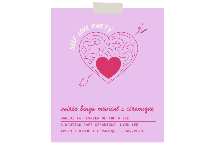 La soirée Bingo chez Manitas Café Céramique : 60€/personne | Musiques iconiques, apéro, douceurs sucrées et surprises au rendez-vous. Samedi 14 février, 18h - 21h.
