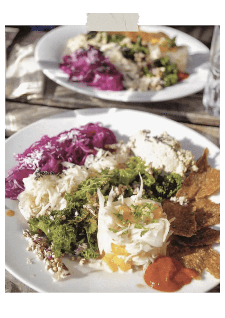 Les plats sont végétariens et visent l’équilibre parfait entre les légumes frais (locaux et de saison), les protéines (légumes secs, fromage ou œufs) et les féculents. Le midi, les clients peuvent choisir entre plusieurs entrées et quatre plats à la carte, qui changent en moyenne toutes les 15 jours, pour suivre l’inspiration des cheffes et ce que la nature a à nous offrir au fil des mois. Des options véganes et sans gluten sont toujours disponibles, non seulement pour satisfaire tout le monde mais aussi pour varier les plaisirs gustatifs et profiter des vertus santé de chaque céréale, chaque ingrédient (Marine est fan de sarrasin).